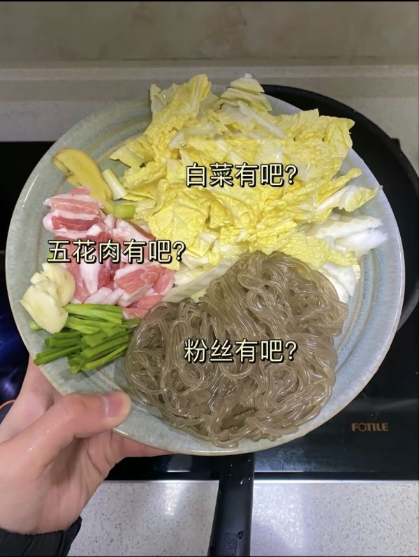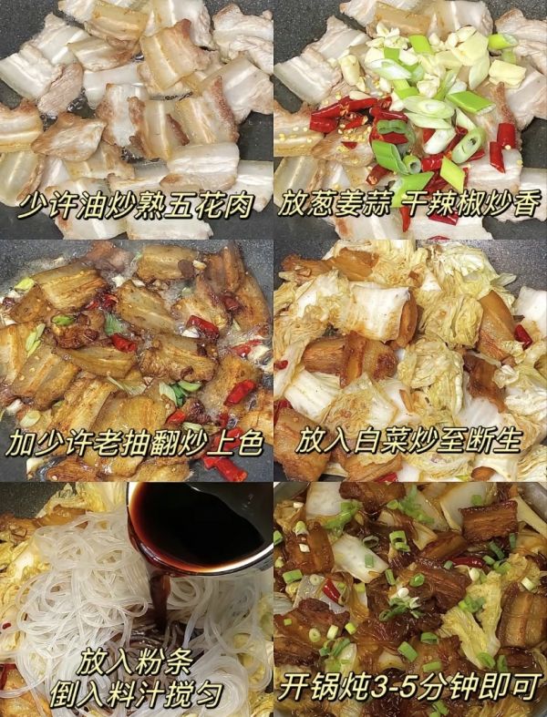 少许油煸炒五花肉,然后放葱姜蒜干辣椒炒香,加少许老抽翻炒上色,放入白菜炒至断生,放入粉条,倒入料汁搅匀,开锅后炖5分钟左右即可