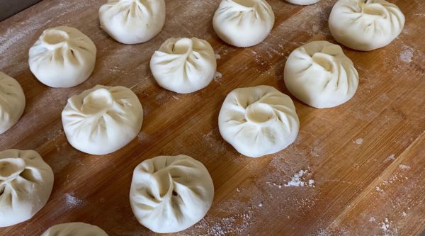 包子皮中盛入馅料。