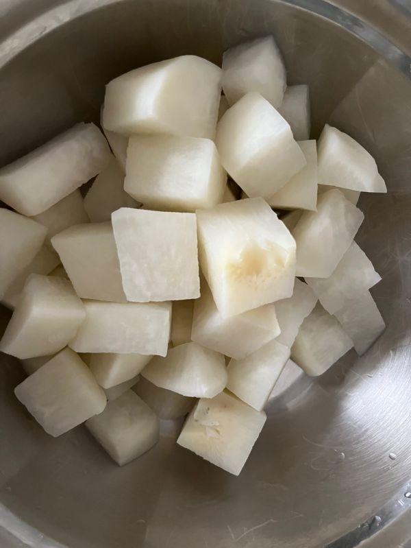 萝卜冷水下锅,水烧开后焯2,3分钟,捞出,过凉水。祛除萝卜臭味。