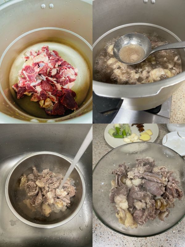 牛肉冷水下锅,大火煮开,撇去浮沫,捞出在用冷水冲洗干净控干备用。
