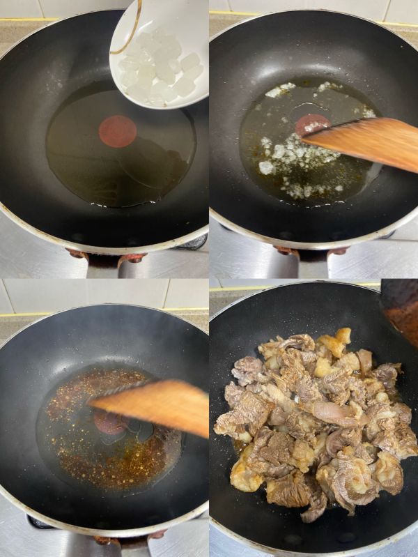 锅中放油放入冰糖,小火慢炒,炒出焦糖色,放入牛肉转中火煸炒上糖色。