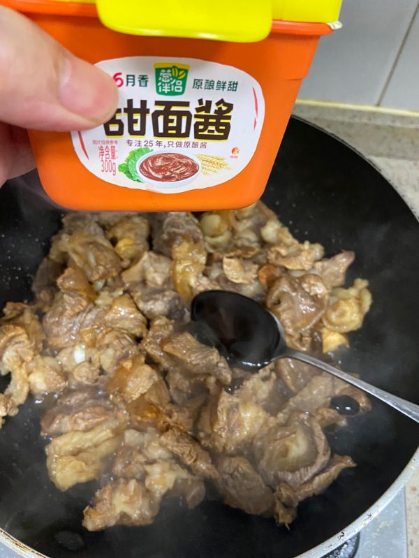 然后加入一1勺六月香葱伴侣甜面酱翻炒均匀。