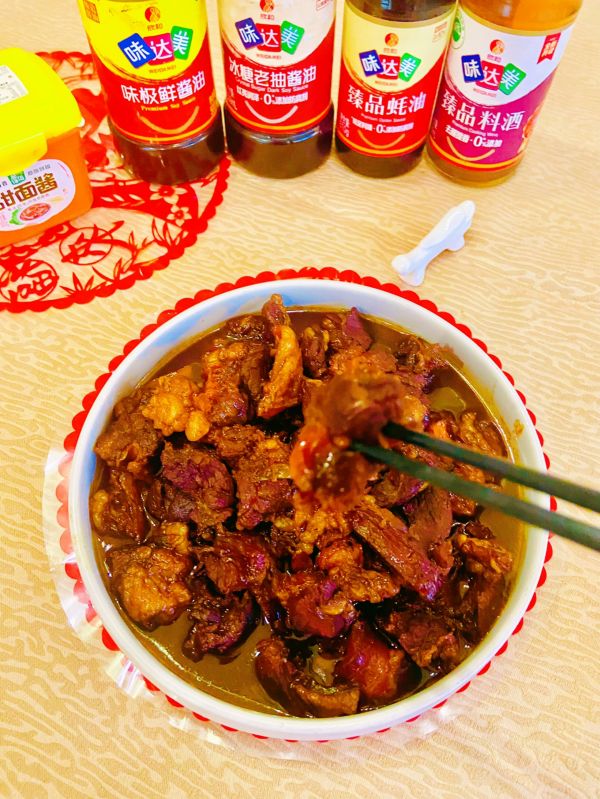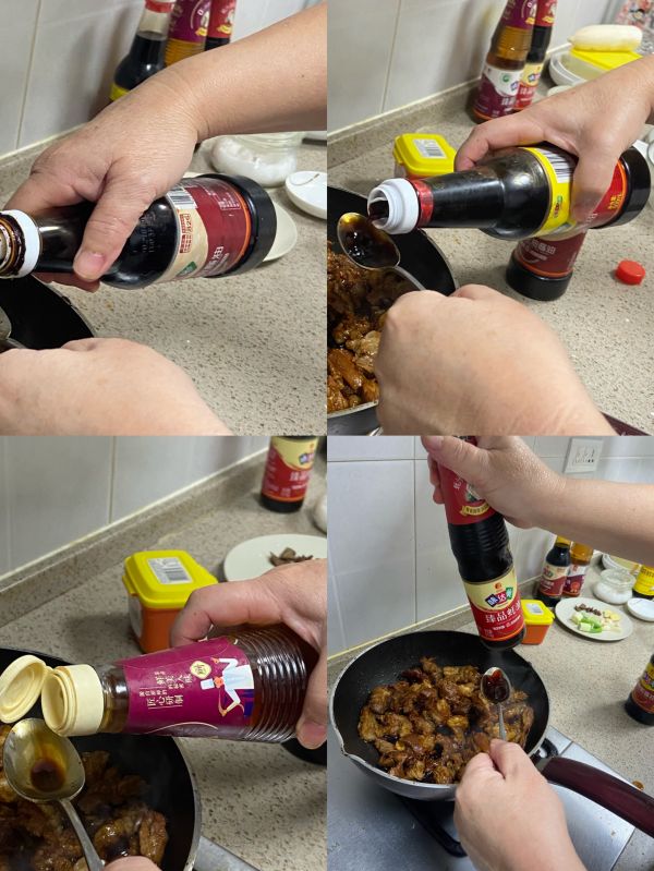 加入2勺冰糖老抽酱油、2勺味极鲜酱油、1勺臻品料酒、1勺臻品蚝油翻炒片刻入味。