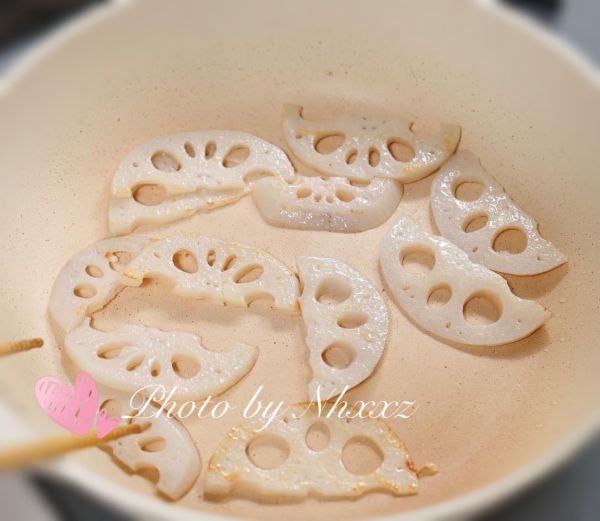 起锅烧油,放入藕片,小火两面煎至微黄,