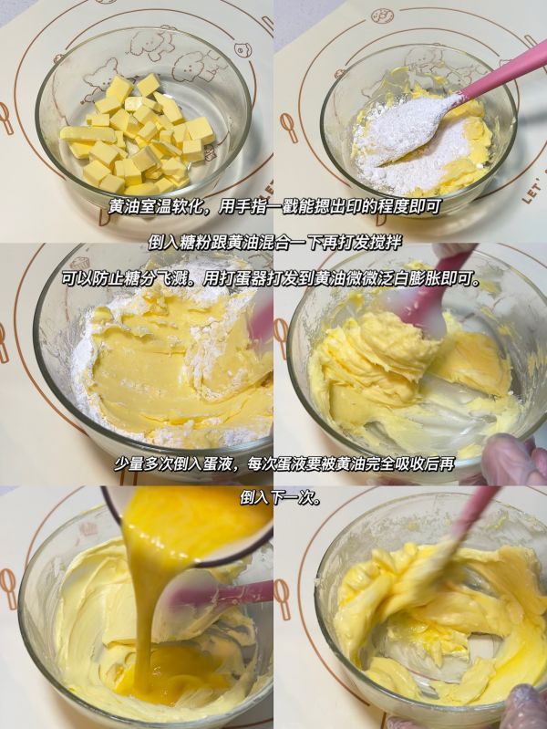 3⃣️少量多次倒入蛋液,每次蛋液要被黄油完全吸收后再倒入下一次。避免水油分离