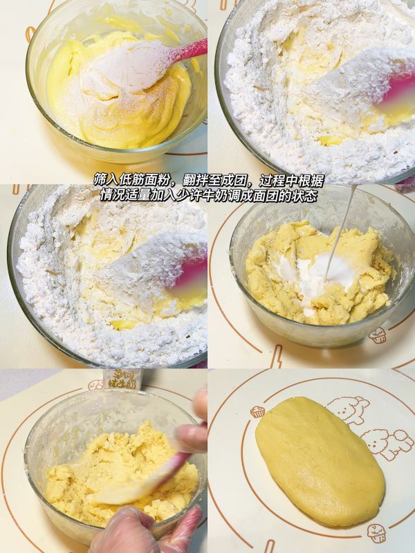 4⃣️筛入低筋面粉,翻拌至成团,根据情况适量加入少许牛奶调成面团的状态。