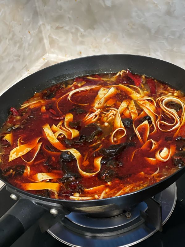 先把鸭血放进去煮七八分钟,我喜欢煮的透一点的有孔会更入味,再把木耳金针菇千张放进去一起煮