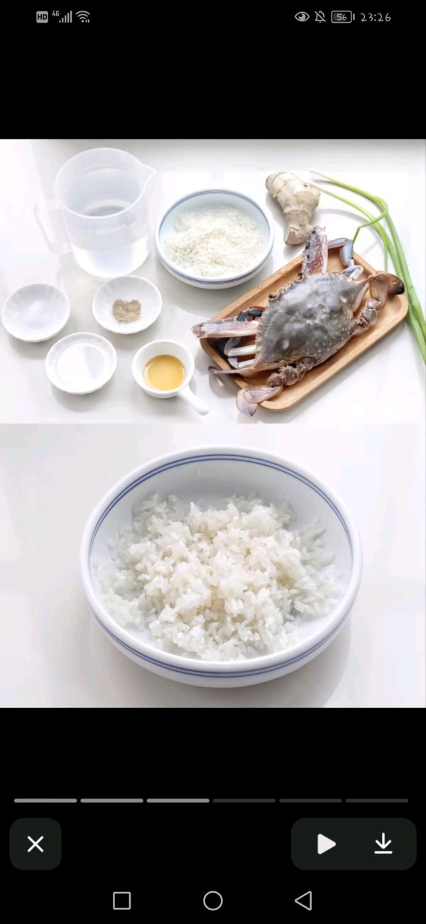 大米倒入砂锅中,加清水大火煮沸腾后,改小火煮半小时左右。待米稍微煮粘稠放入姜丝和蟹块,继续小火煮十分钟