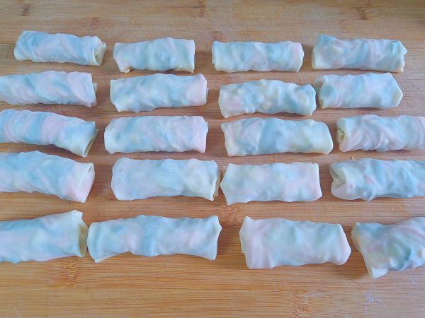 全部卷好后,只要不散开就行,接着就可以开始煎了。电饼铛预热刷油,放入小面卷,先煎一分钟,底部金黄后再淋上半碗清水。盖上盖子中火焖3分钟,这时候蔬菜卷基本就熟透了,颜色也都出来了,非常的晶莹剔透。如果喜欢吃两面都是焦焦的就翻个面再煎1分钟,两面就都是金黄焦脆的口感了。