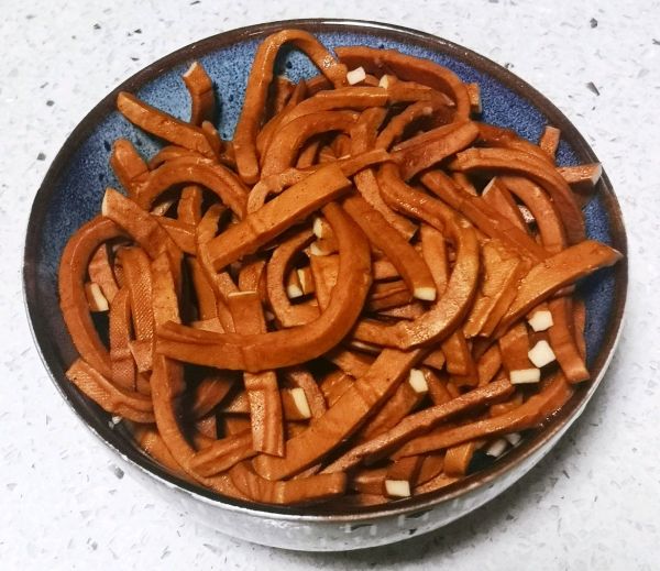 倒入豆腐丝,最后发葱丝,盐,鸡精即可。