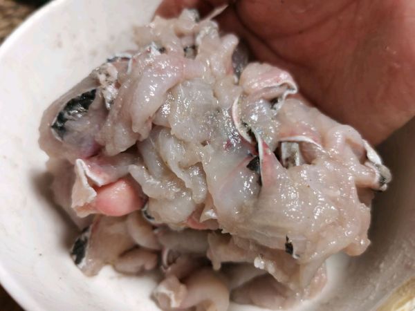 另外黑鱼的边角料也别浪费了,洗干净后加点盐,白胡椒,姜片,淀粉腌制一下,炒鱼片的锅都不用洗了直接做鱼汤。热锅热油将鱼块边角料下入锅里煎一下