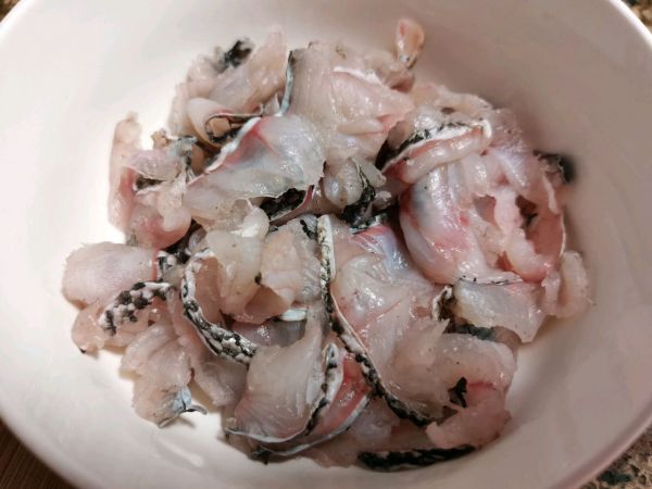买一条黑鱼让菜市场老板把两边的肉片下来,拿回家洗干净后将鱼皮朝上用开水淋一下,鱼皮瞬间收缩并且片鱼片的时候不会觉得很滑