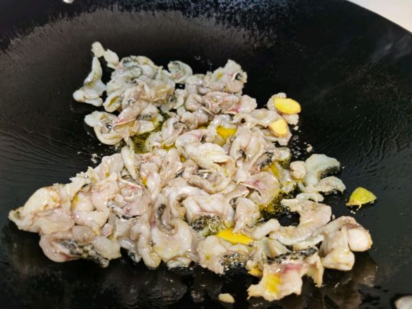 铁锅冒烟后加入油烧热后把鱼片倒进去用锅铲打散开,全程中火直到每片鱼片定型后盛出来备用。炒鱼片的油一定要多一点