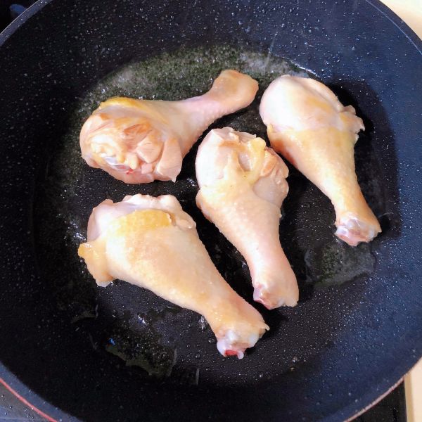 放入鸡腿慢慢煎至两面金黄,捞出待用。