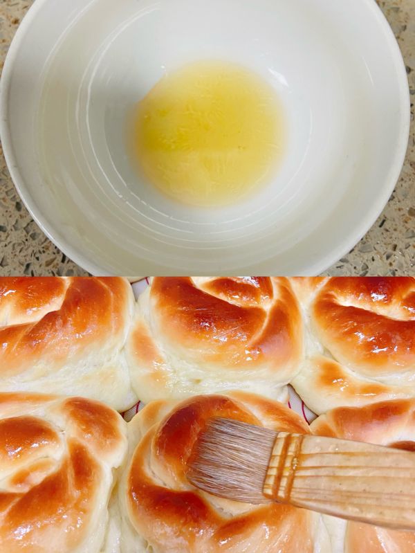 一勺蜂蜜兑点水调匀,面包出炉后趁热刷上蜂蜜水。