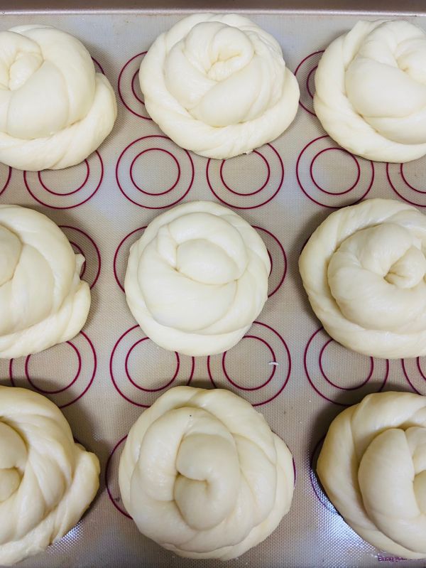 把面团搓成长条,从中间对折,然后拧几下从一头卷起盘在一起,一个面包坯就做好了。