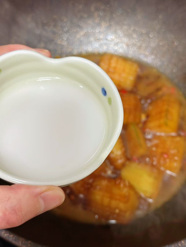 汤汁三分之一的时候加入适量盐鸡粉调味,然后加入一小碗水淀粉勾芡一下
