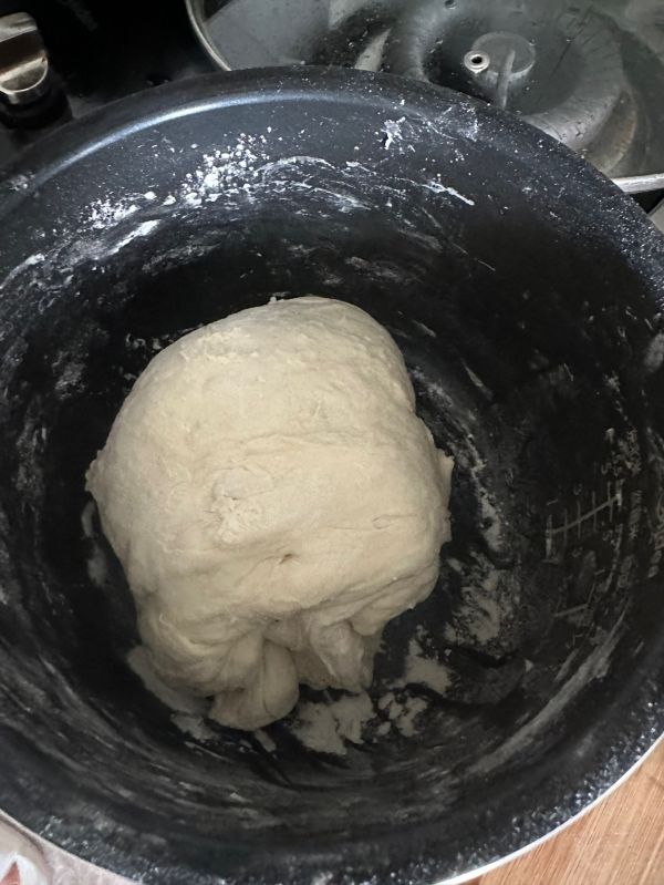 500g面粉加250ml水、适量食盐和酵母,一起揉好,夏天发酵约一个小时。冬天温度低,需要发酵更长时间