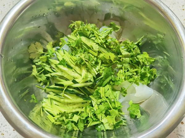 准备好拉皮,黄瓜切丝,香菜切段,还有捞汁以及准备自制辣椒油的料。