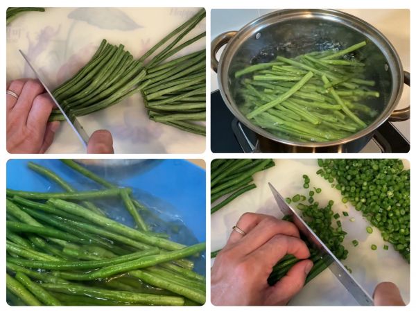 洗净的豇豆 切成大段,入开水锅中煮2分钟左右。 煮至断生的豇豆 捞出 过冷水 反复过凉后 控干水。 烫熟的豇豆 切成小丁。