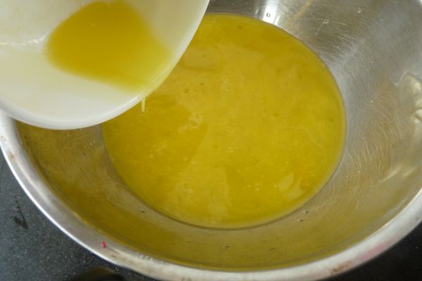 加入泡芙粉稍拌,蛋分几次加入黄油与水混合