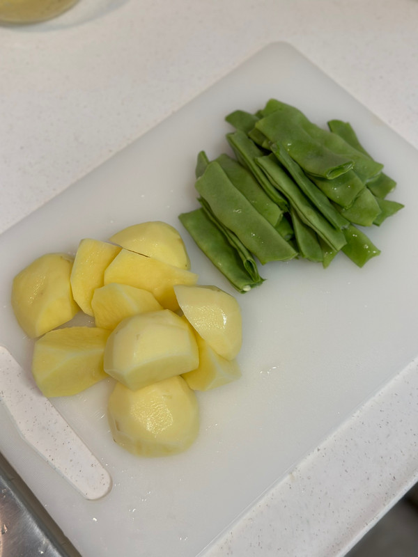 准备土豆切滚刀块,块要大一点好吃 芸豆去筋掰小段