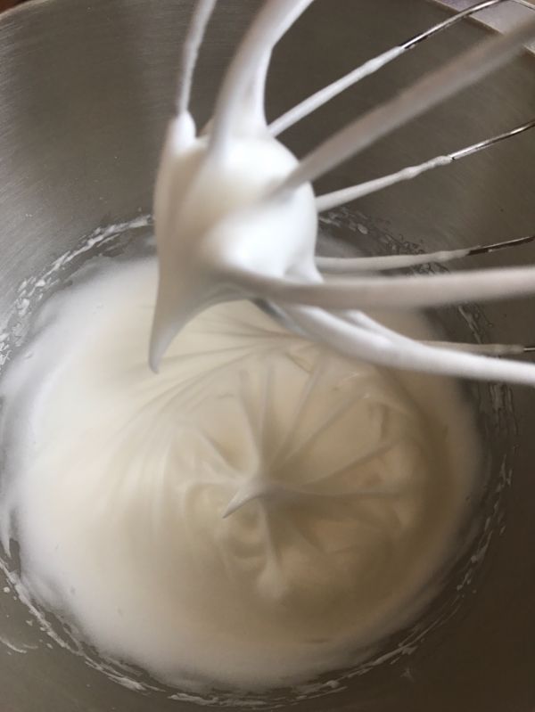 糖分3次加入,蛋清打发粗泡加入3/1细砂糖,蛋清打发看到纹路慢慢在桶的边缘加入砂糖