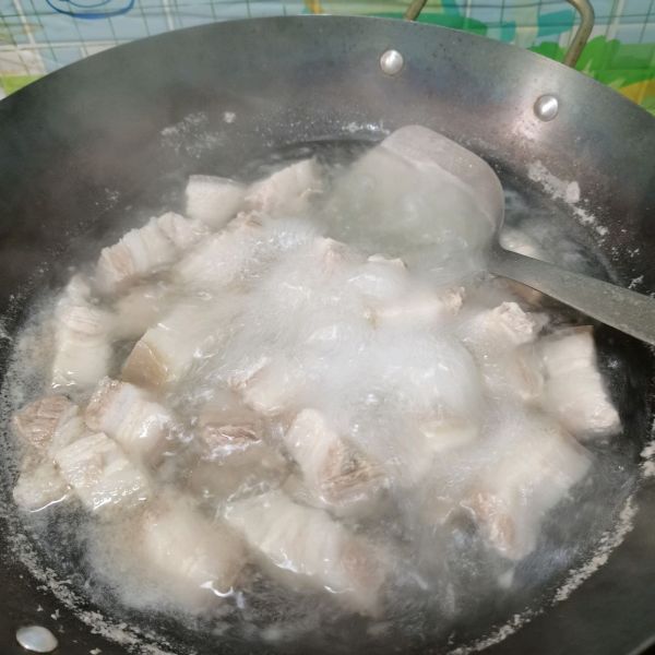 泡好的肉块冷水下锅放点料酒焯水!烧开五分钟就关火