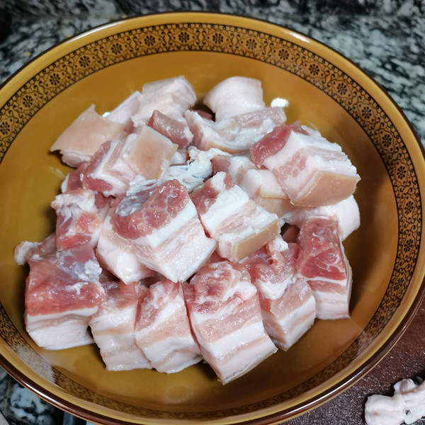 首先准备好一块五花肉,把皮上的毛毛燎燎