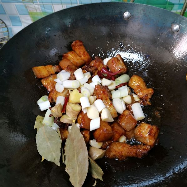 立马加入煎过油的肉块翻炒上色!这糖色炒的还不错吧嘿嘿