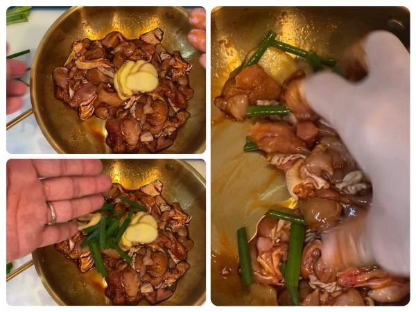 拌匀的鸡腿肉中 加入姜片 葱段 拌匀后 腌制30分钟入味。