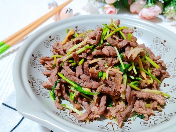 炒锅入油,放入牛肉丝,炒至变色,加入生抽炒匀