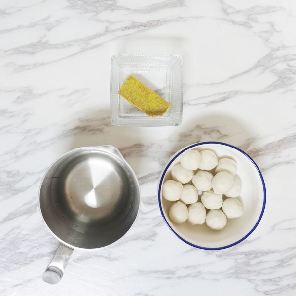 按照烹饪步骤准备好以下食材: 150g鱼丸解冻、20g咖喱块、10g蚝油、300g清水。
