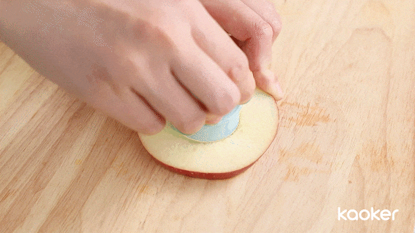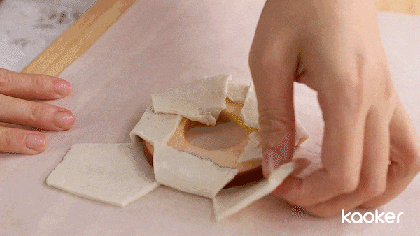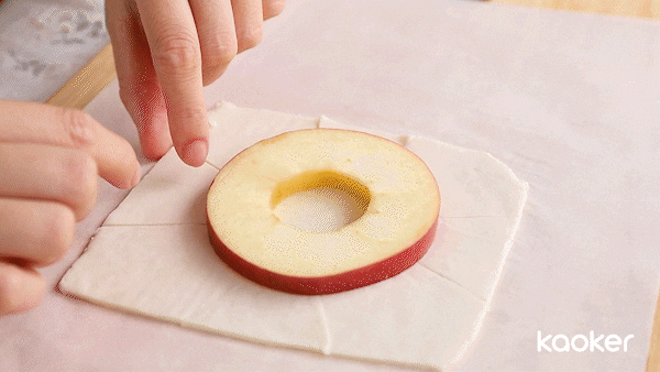把苹果片放在酥皮的中间,酥皮的四周切几刀。