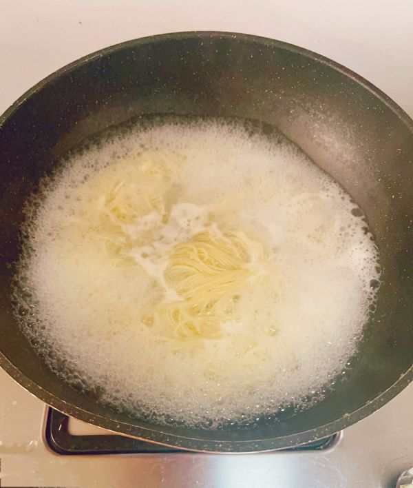 面条煮熟后直接捞入碗中,焯烫一下菠菜。