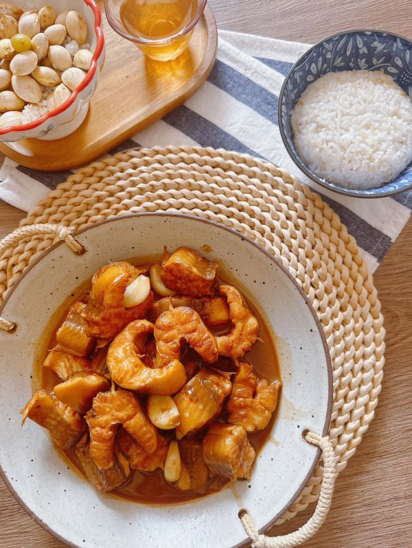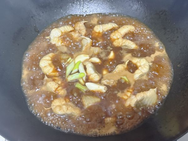 倒入红烧酱油,生抽和半勺盐,慢炖20分钟,收汁后出锅
