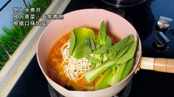 倒入水煮开,放入青菜、面条煮熟,根据口味加盐