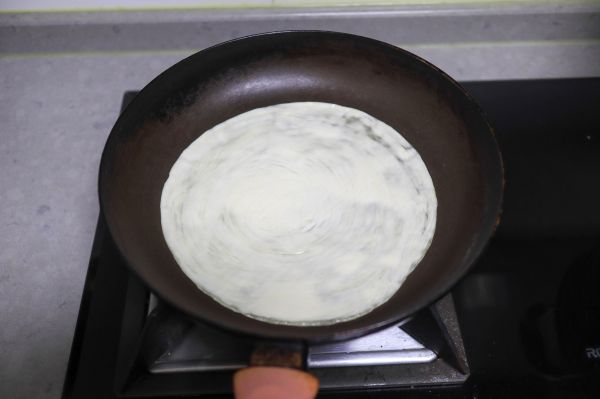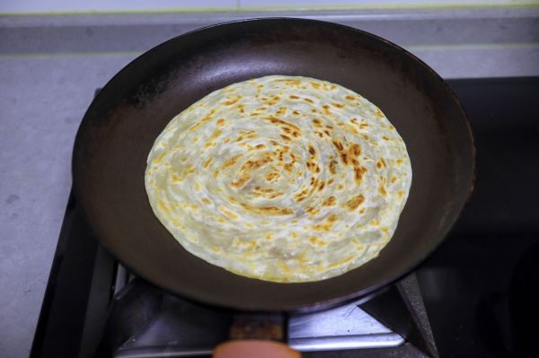煎锅加热,手抓饼入锅,中火烙,饼坯由白色变成大部分透明状时翻面