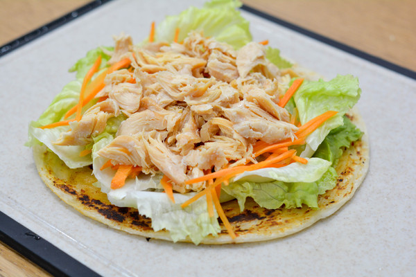 出锅,放在案板上,铺上生菜、胡萝卜丝、鸡胸肉