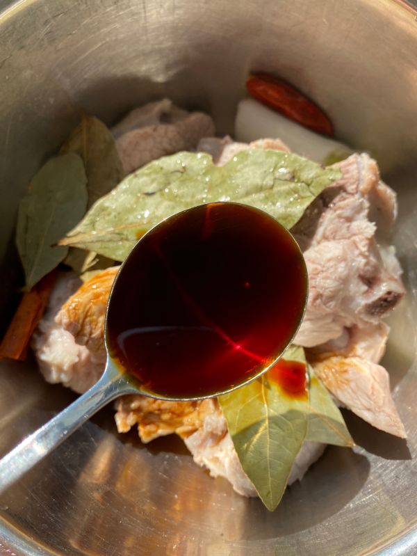 排骨冷水入锅,加葱姜料酒焯水去腥,捞出沥干水分备用