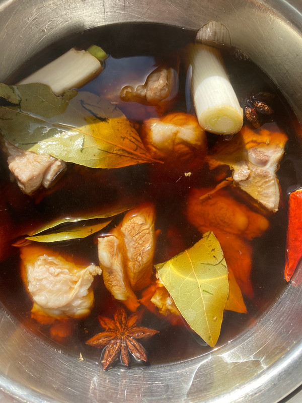 高压锅中放葱段姜片等香料,加入洗净的排骨