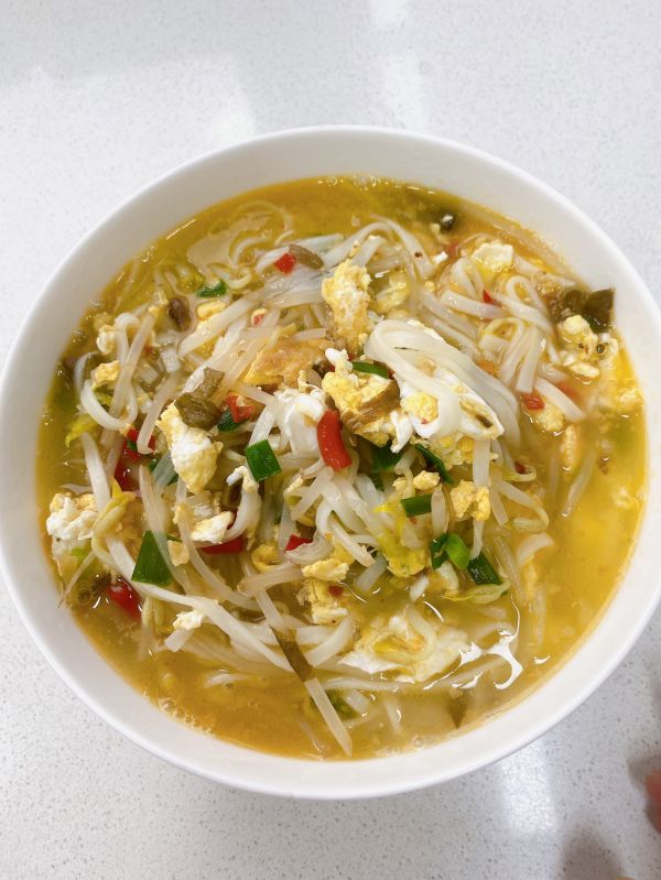 倒入开水,翻滚倒入豆芽和面