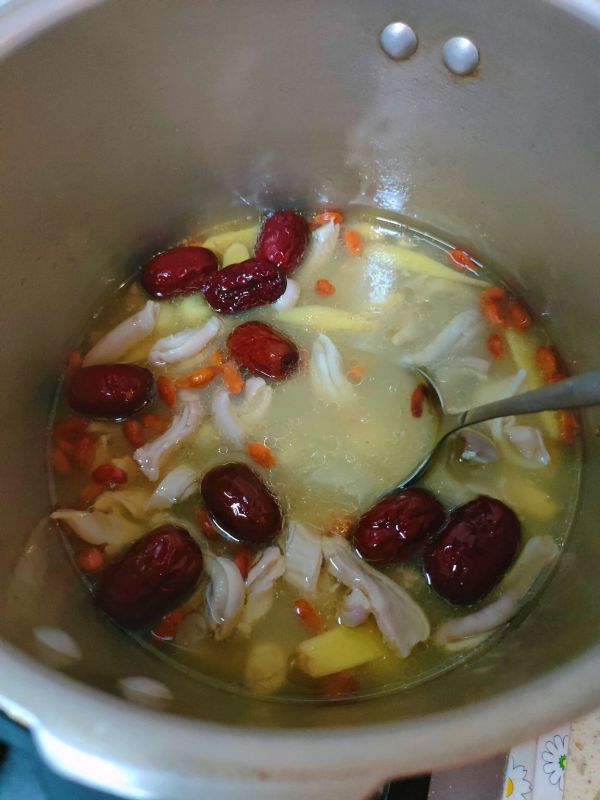 把枸杞子,红枣放进去,加盐,味精