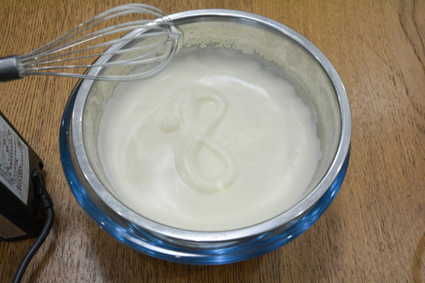 2个鸡蛋入打蛋盆,坐在水温60度的盆里,用打蛋器打出粗泡后加入40克细砂糖,先高速打发,鸡蛋糊变乳黄色,提起打蛋器划8字,痕迹15秒不消失,再用低速打1分钟整理气泡