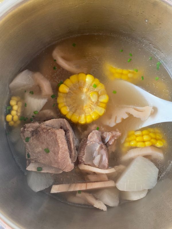 高压锅中放入玉米,莲藕,白萝卜排骨加适量葱段姜片,加入开水,高压锅上汽后转中小火煮15分钟