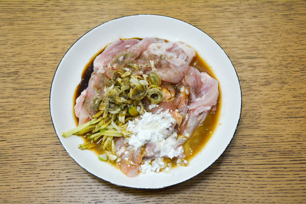 鸡腿剔骨,鸡肉带皮切厚片,如果不喜油脂,可将鸡皮剔掉不用;