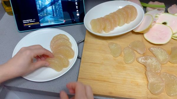 柚子洗干净,头尾切掉,中间切个十字把皮剥掉