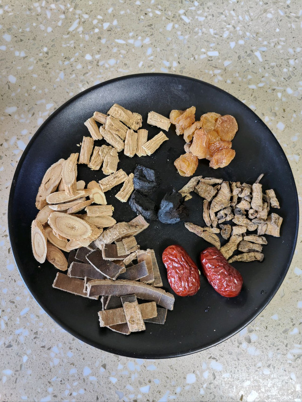 汤料:巴戟、杜仲、党参、黄芪、熟地、桂圆、红枣。
