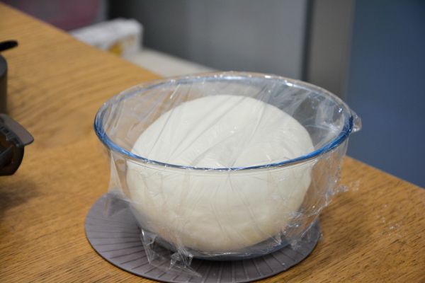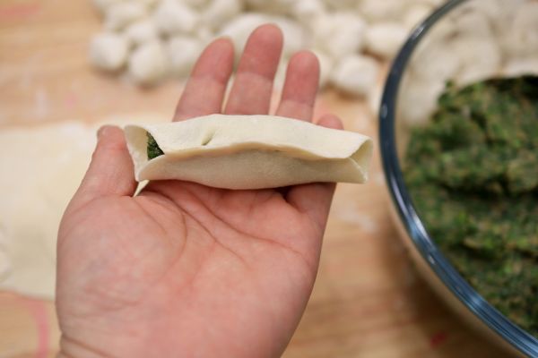 饧好的面团放案板上,搓长条,切剂子,擀成椭圆形面皮