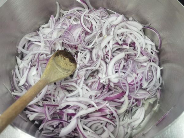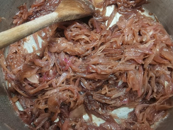 热锅冷油,将紫洋葱丝炒至酥软。